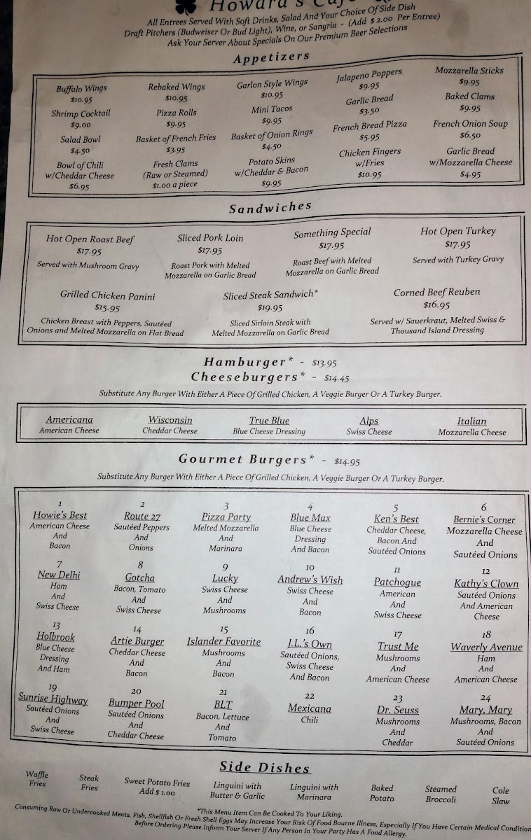 Welcome to Howard's Cafe, a charming American restaurant located at 2254, 404 S Service Rd, Patchogue, NY. Known for its local charm and hearty portions, this cafe offers a delightful menu that caters to everyone. The lunch selections feature a variety of chicken dishes—all priced at $18.95—as well as seafood options like Shrimp Scampi and Stuffed Flounder, priced at $21.95.